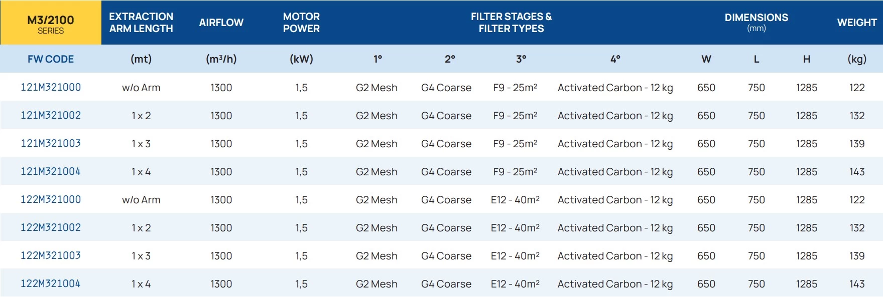 M3/2100 – tai mobilus dūmų ir smulkių dulkių ištraukimo įrenginys su aktyvintos anglies filtru bei vienguba akrobatine ranka. Šis modelis yra pritaikytas darbams, kurių metu išsiskiria kvapai ir dujos, tokie kaip suvirinimas ar mažai legiruoto metalo apdirbimas. Filtras efektyviai sulaiko tiek kietąsias daleles, tiek kvapus, todėl idealiai tinka darbams, kur reikalingas didesnis oro švarumo lygis. M3/2100 atitinka visus Europos saugos reikalavimus, veikia tyliai (72 dB) ir užtikrina saugų naudojimą net intensyvioje gamybinėje aplinkoje.