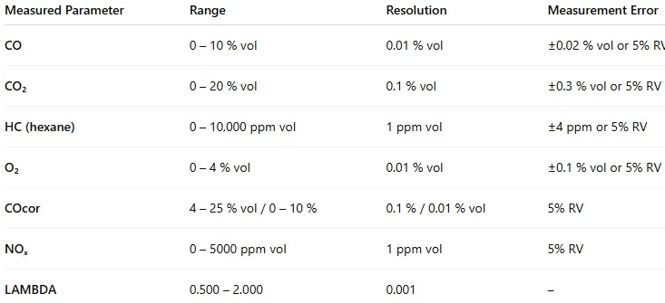 • Suitable for measuring CO, CO₂, HC, O₂, and NOₓ concentrations