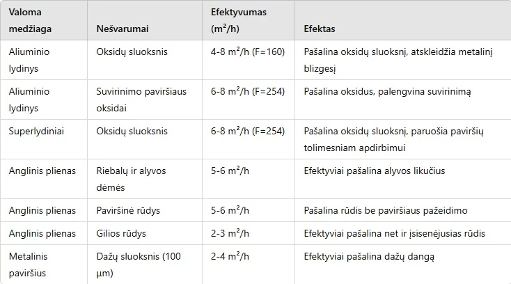 Valymo efektyvumas (priklauso nuo medžiagos ir nešvarumų tipo):