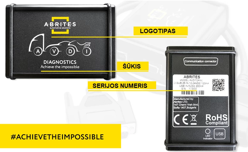 Įsigydami arba domėdamiesi ABRITES AVDI diagnostikos įranga, pastebėsite logotipą, serijos numerį ir įmonės šūkį - „Achieve the impossible“. O klonuotuose gaminiuose nepavyksta nukopijuoti šių vaizdinių detalių taip tiksliai arba jos yra tiesiog nerašomos ant prietaiso. Jie bando prekinį ženklą rašyti su santrumpomis, panašiais į originalų AVDI.