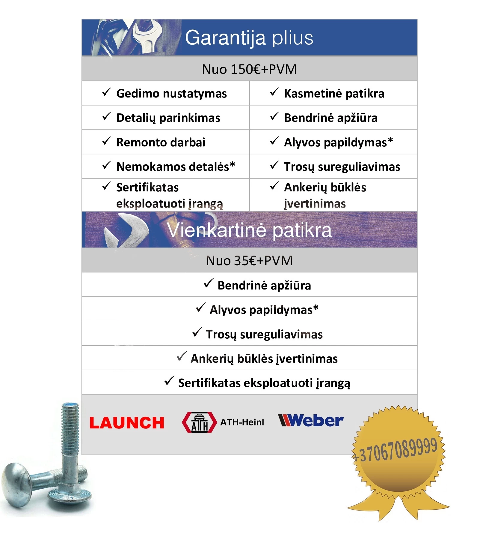 Pratęstos garantijos paslauga suteikiama visai mūsų prekiaujamai produkcija, išskyrus mechaninius įrankius ir dalis. Papildoma garantija apima: visą diagnostikos įrangą, visų tipų keltuvus, kondicionierių pildymo įrangą, oro kompresorius, visus patikros stendus, visų tipų stakles ir žibintų reguliavimo įrangą.