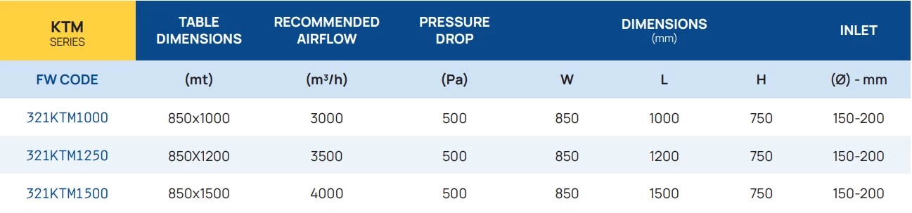KTM Downdraft – tai stacionarus suvirinimo ir šlifavimo stalas, sukurtas efektyviam dūmų ir dulkių surinkimui tiesiai nuo darbo paviršiaus žemyn nukreipta trauka. Šis stalas idealiai pritaikytas dulkių šalinimui, susidarančiam šlifuojant nedideles metalines detales, taip pat puikiai tinka lengvo ir grubaus šlifavimo ar suvirinimo darbams. Stalas pagamintas iš tvirtos, ilgaamžės medžiagos, jame integruotas dulkių stalčius, o darbo paviršius dengtas storu chromuotu tinkleliu. Be to, šis stalas gali būti prijungtas prie centrinės filtravimo ar ventiliacijos sistemos.