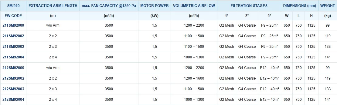 Aprašymas: SM/920 – tai stacionarus dūmų ir smulkių dulkių ištraukimo įrenginys, skirtas naudoti su vienkartiniu kasečių filtru ir dviem lanksčiomis ištraukimo rankomis. Šis įrenginys idealiai tinka dirbtuvėms su ribota erdve ir yra pritaikytas suvirinimo darbams bei paprastu arba šiek tiek tvirtesniu plienu. Kompaktiška konstrukcija leidžia efektyviai filtruoti žemo ir vidutinio intensyvumo dūmus bei dulkes, užtikrinant švarią ir saugią darbo aplinką. Filtrų užterštumo indikatoriai padeda sumažinti nereikalingus priežiūros sustojimus, o išorinė valdymo panelė užtikrina lengvą prieigą.
